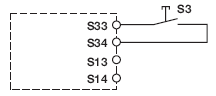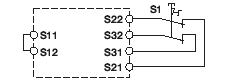 如果是雙通道不檢測觸點(diǎn)間短路故障工作方式的話則是短接S21和S22,兩個常閉觸點(diǎn)分別置于S11和S12,S11和S32之間。