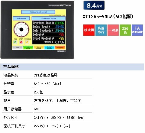 GT1265-VNBA | 10.4寸 VGA, TFT256色,交流供電,自帶232/422/以太網(wǎng)接口 | 常用 |
