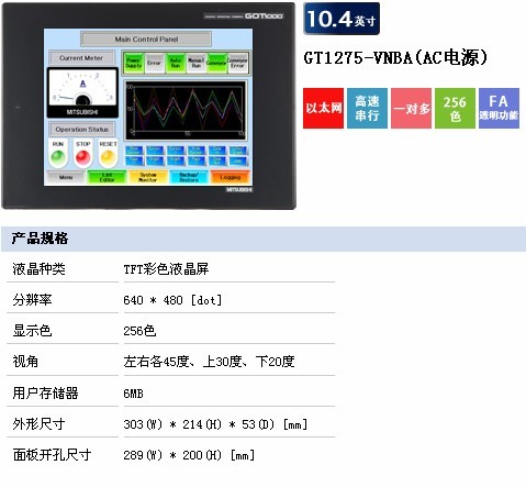 GT1275-VNBA | 10.4寸 VGA, TFT256色,交流供電,自帶232/422/以太網(wǎng)接口 | 很常用 |