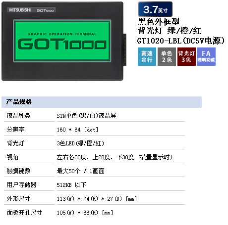 GT1020-LBL-C | 3.7寸,STN藍白單色,從PLC編程口供電,RS-232下載 |